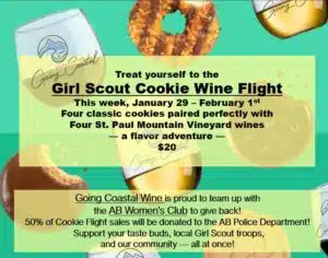 Going Coastal Wine is proud to team up with the AB Women’s Club to give back! 50% of Cookie Flight sales will be donated to the AB Police Department! Support your taste buds, local Girl Scout troops, and our community— all at once!